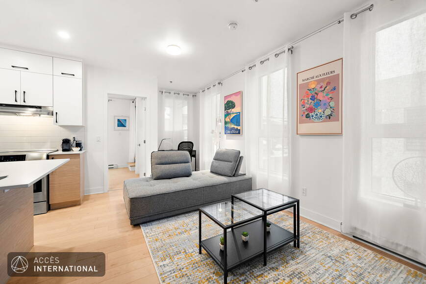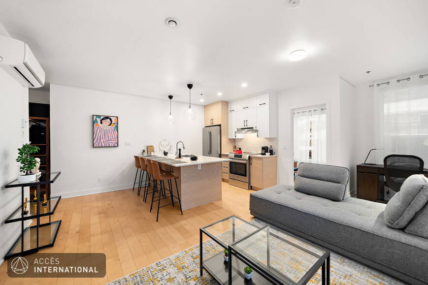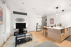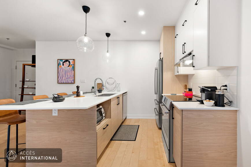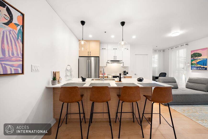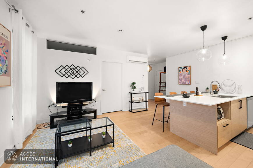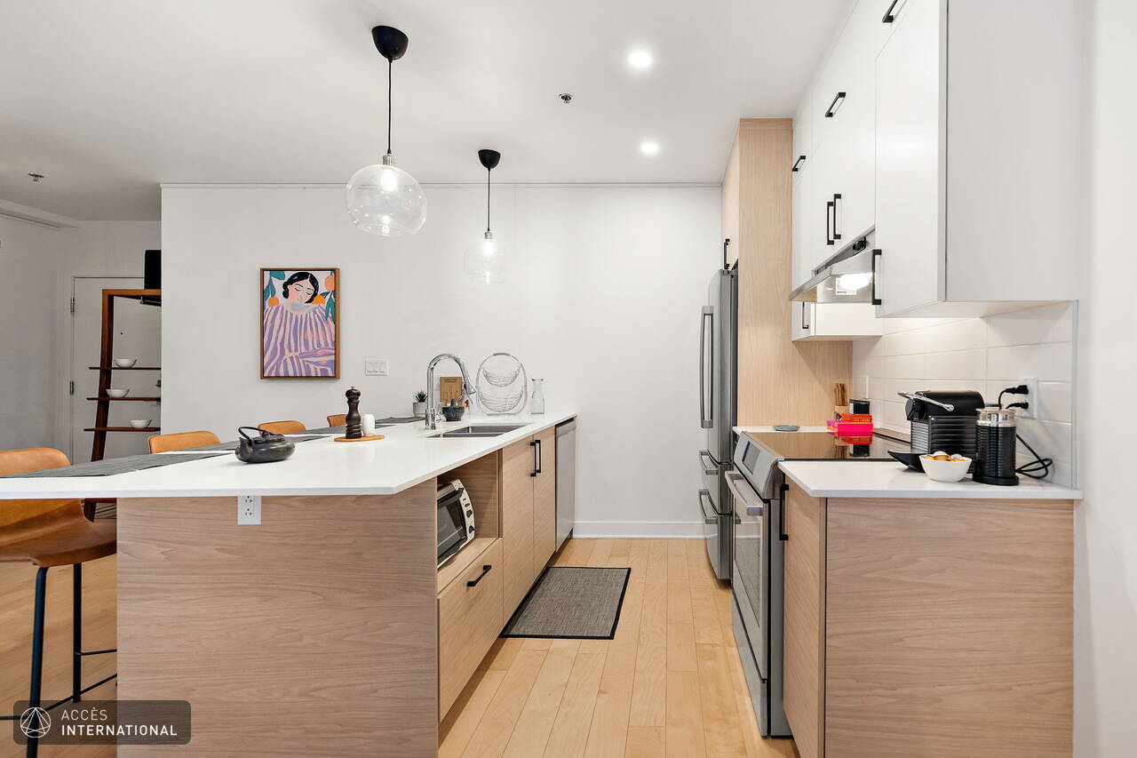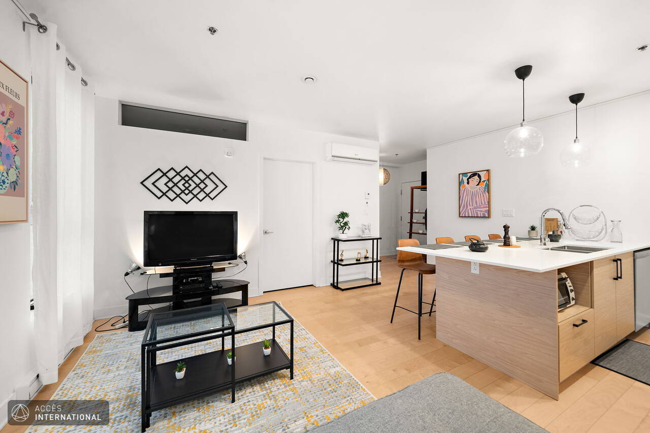 L'unité propose un espace de vie principal lumineux et convivial à aire ouverte avec vue sur le Mont-Royal et le pont Jacques-Cartier.