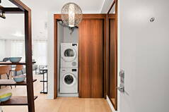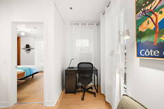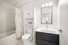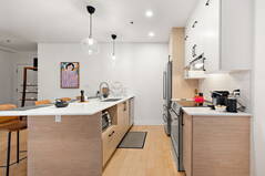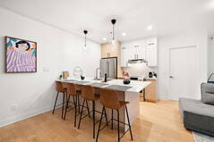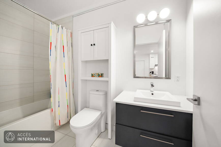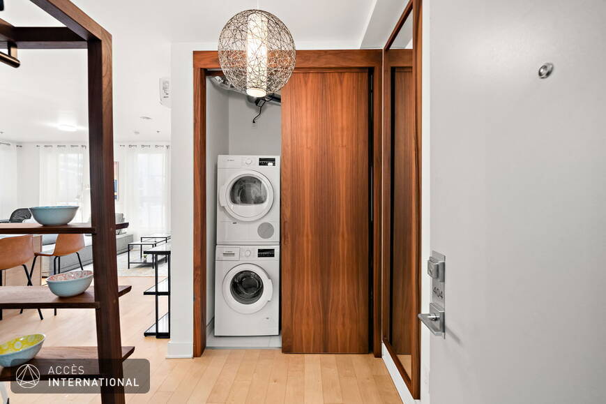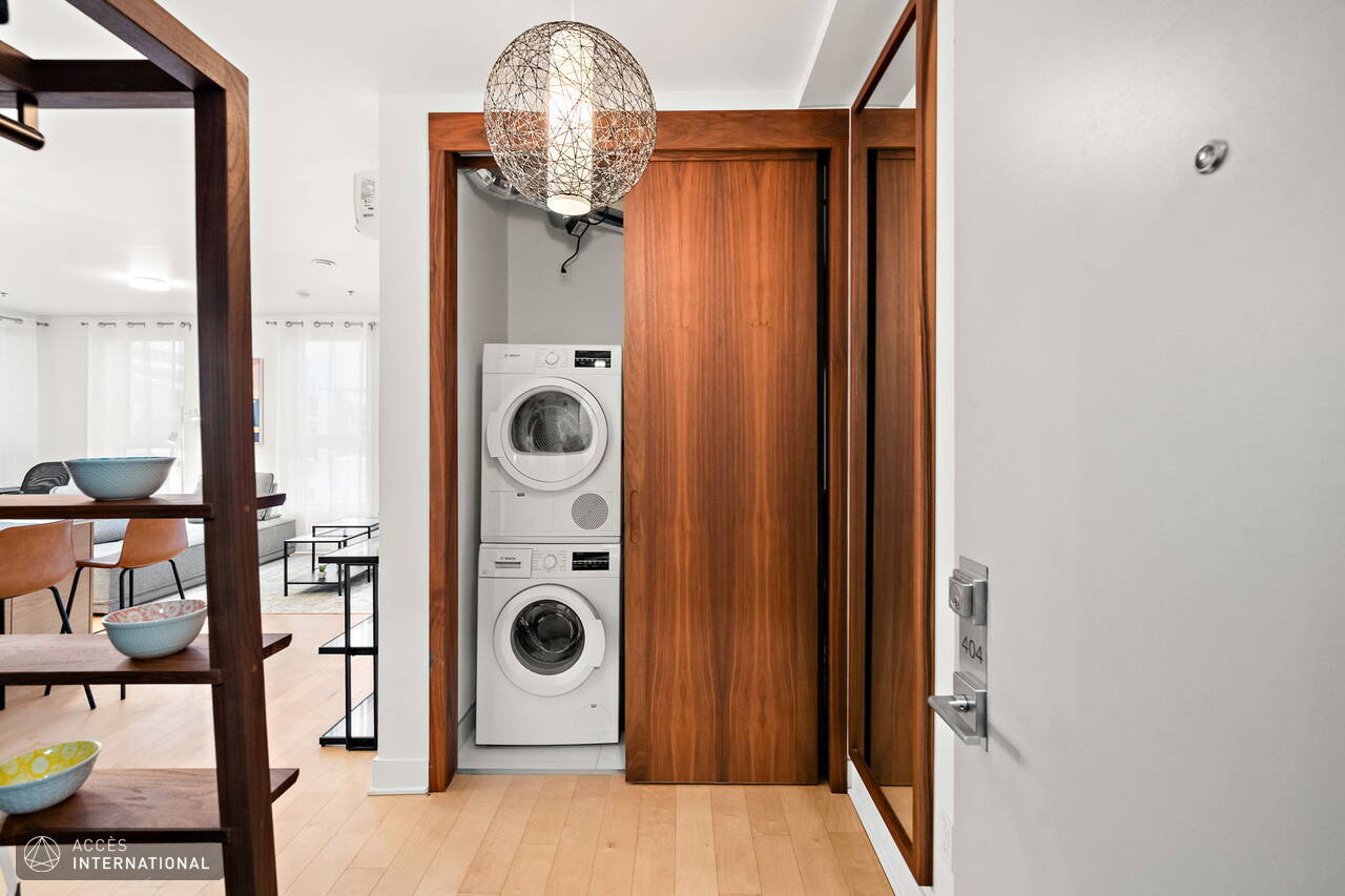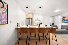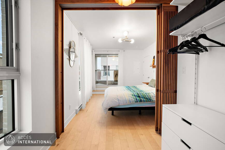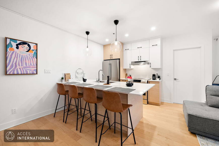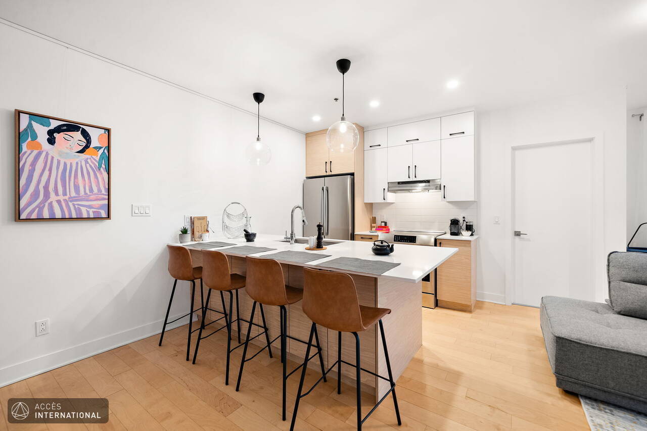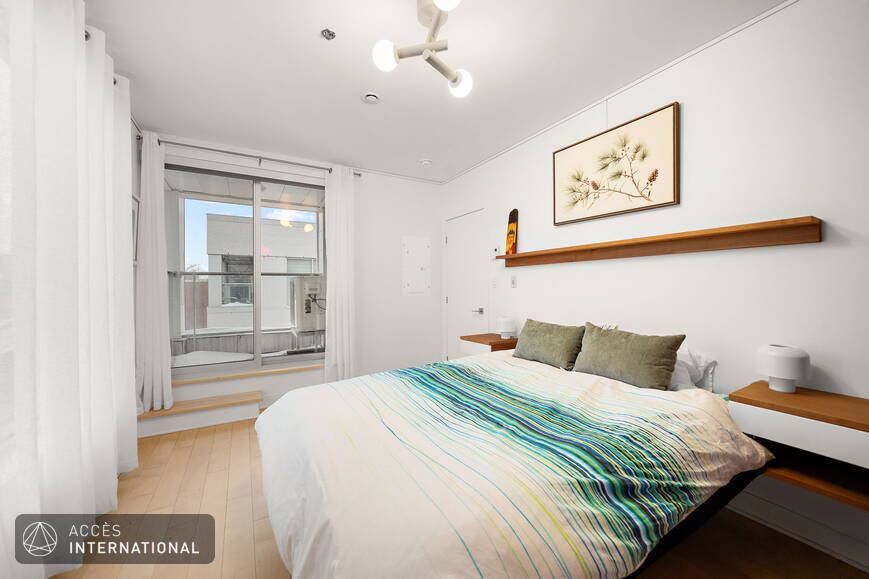 L'unité propose un espace de vie principal lumineux et convivial à aire ouverte avec vue sur le Mont-Royal et le pont Jacques-Cartier.