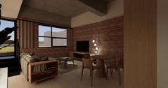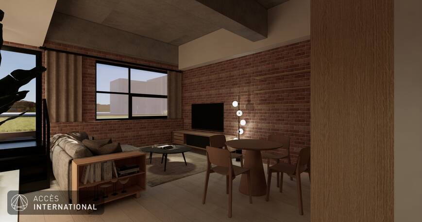 - Salon et salle à manger ouverts avec haut plafond et poutres en béton